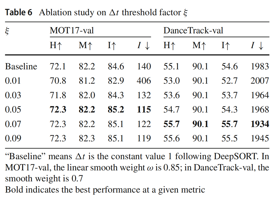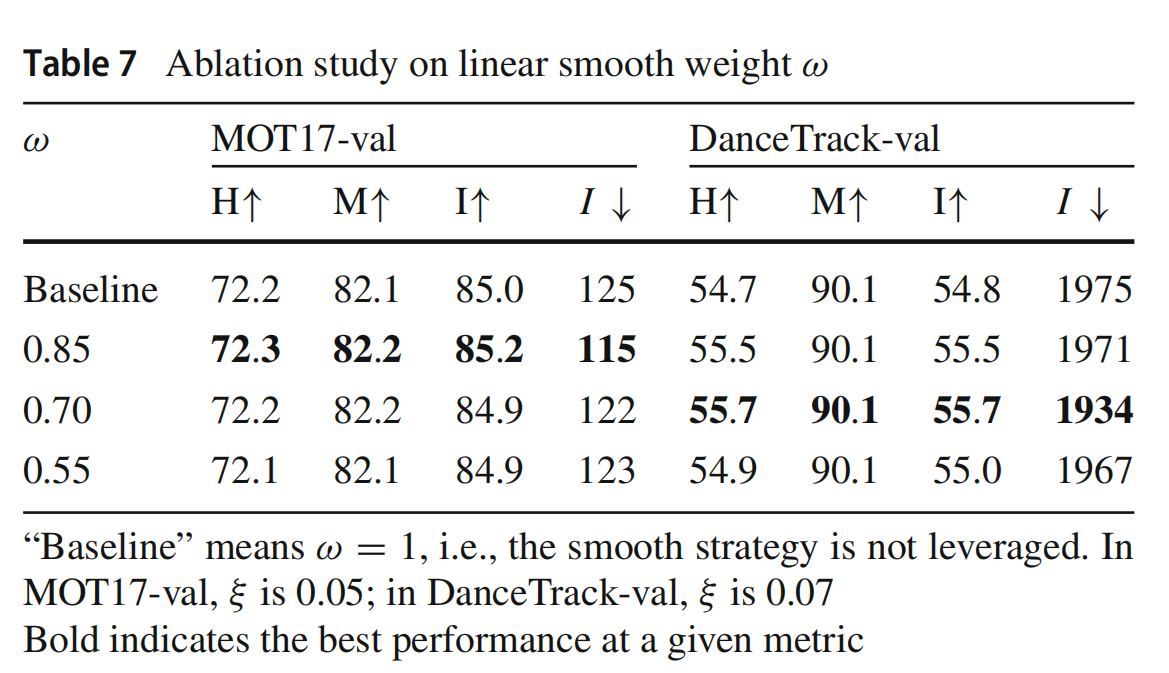 线性平滑权重ω的引入对于减少物体运动中产生的噪声至关重要,因此,在表7中,具有最佳ω值的Fast在两个数据集的HOTA和IDF1指标上的表现优于“基线”。由于不同类型场景中的噪声不同,ω的值也需要具体设置。从表7的实验中可以看出,ω的值大致在0.85到0.70之间。经验上,我们建议ω的默认值为0.85,当跟踪场景中的物体运动(如舞台场景)高度非线性时,可以适当降低到0.70以获得更好的跟踪结果。