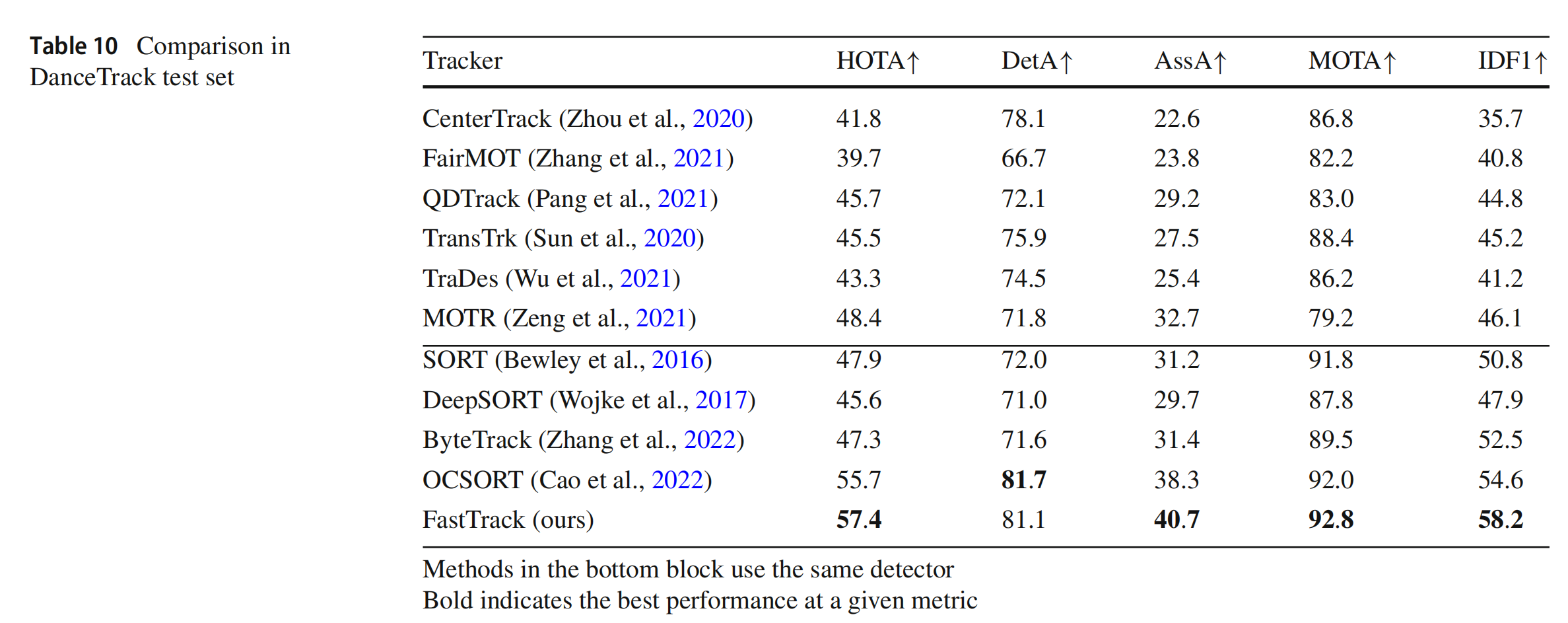 我们在表10中报告了DanceTrack测试集的结果,以评估Fast在具有挑战性的非均匀运动下的性能。测试期间超参数的设置与DanceTrack-val相同,即ξ为0.07,ω为0.7,并且在成本矩阵中不使用HIoU。我们提出的非均匀公式和减速策略成功地模拟了舞台场景中舞者的多样化非均匀运动,因此Fast在HOTA、MOTA和IDF1上达到了新的最佳水平。使用相同的检测器(YOLOX),Fast在HOTA上比OCSORT高出1.7%,比BYTE高出10.1%。