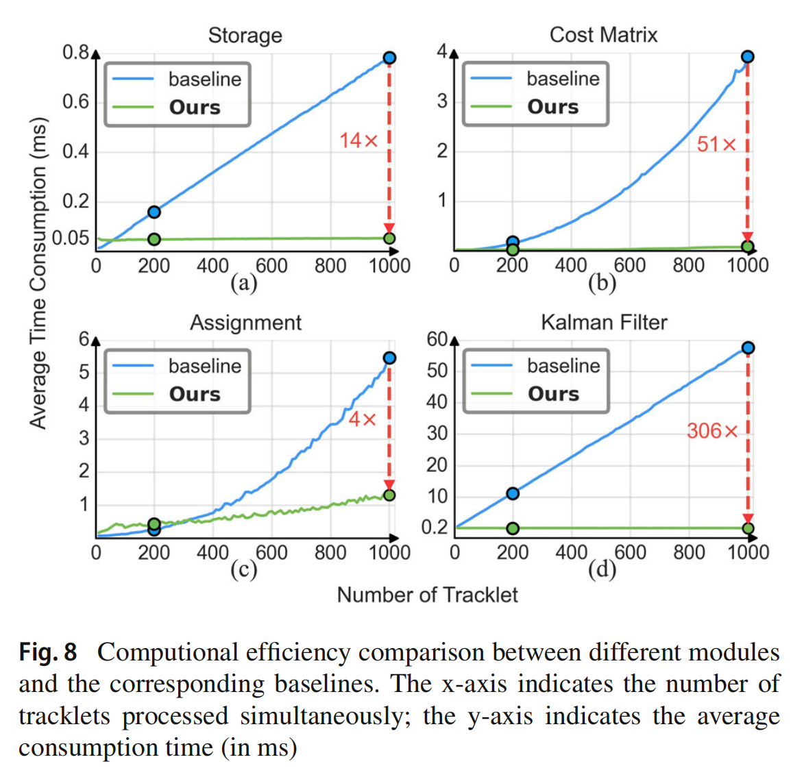 如图8所示,我们比较了我们提出的模块与相应的基于CPU的基线的时间消耗。为了研究每个模块的最大计算效率,我们定义了一个极端情况,将轨迹数设置为1000。相反,我们将典型情况定义为将轨迹数设置为200,作为现实大规模对象跟踪情况下计算效率的代表。