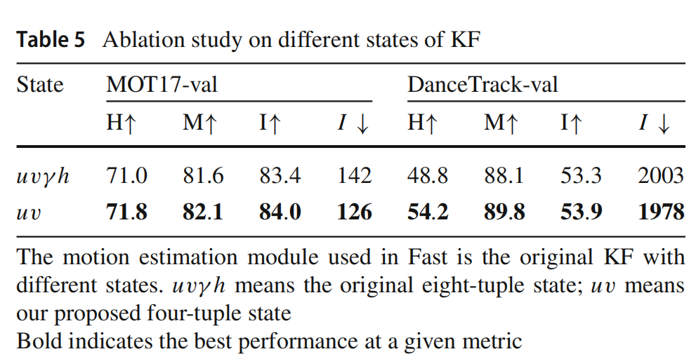 表5显示了不同状态的KF作为Fast的运动估计模块的实验结果。这里我们使用了具有不同状态的原始KF。uvγ h表示原始的八元组状态;uv表示我们提出的四元组状态。当从状态估计中移除γ和h时,Fast在所有指标上都表现出更好的性能,这也与第2.2节中的先前分析一致,即γ和h的均匀建模是不合理的,它们应该从KF的状态估计中移除。