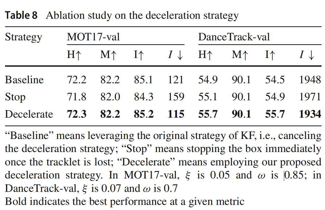 减速策略表8展示了我们减速策略的实验结果。对于MOT17-val,由于样本量小且其中的遮挡问题不严重,与“基线”相比,四个指标的改进很小。对于DanceTrack-val,结合足够的数据样本和严重的遮挡问题,我们的策略在HOTA和IDF1上比“基线”提高了1%。此外,立即停止丢失的对象与“基线”相比,在两个数据集中都没有显著优势。