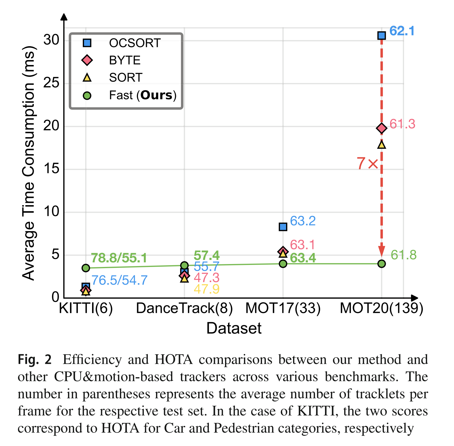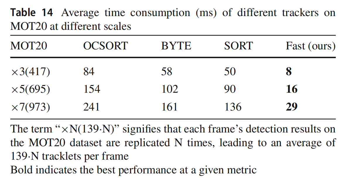 图2展示了不同基于运动的跟踪器在四个基准测试上的平均处理时间。比较是在一台装有NVIDIA GTX 1080Ti和Intel Core i5-9500的单台PC上进行的。跟踪器在四个测试集上处理的平均对象数分别为6(KITTI)、8(DanceTrack)、33(MOT17)和139(MOT20)。如第5.2.4节所讨论的,我们新范式Fast的计算效率与输入规模无关,所有四个基准测试的平均时间消耗为4毫秒。当输入规模较小时(例如KITTI上的6个),额外的内核函数启动时间抵消了Fast的计算优势,导致Fast比其他基于CPU的跟踪器花费更多时间(4毫秒对1毫秒)。随着输入规模的增加,基于CPU的跟踪器的时间消耗迅速上升,而Fast的时间消耗保持恒定在4毫秒。例如,在MOT20上,Fast每帧保持在4毫秒,而OCSORT和BYTE分别需要30毫秒和20毫秒。即使在嵌入式CUDA设备Jetson AGX Xavier上,Fast在MOT20上的平均时间消耗仅为24毫秒,而OCSORT和BYTE分别需要231毫秒和67毫秒。为了进一步展示Fast在极端情况下的效率,我们在表14中比较了四种方法在不同规模的MOT20上的时间消耗。我们通过在MOT20测试集上复制每帧的检测结果N次来评估跟踪器在大规模对象跟踪场景中的效率。具体来说,我们将第i个复制结果的x坐标向右移动i×W像素(W为帧宽度),同时保持y坐标不变,从而将每帧的对象数量增加N倍。这种模拟在现实世界场景中是合理的,因为虽然单个视频流可能不会每帧包含1000个轨迹,但在现实场景中通常需要同时合并和跟踪多个流。表14表明,Fast在大规模对象跟踪场景中比其他跟踪器具有显著优势。例如,当N等于7时,Fast每帧处理时间为29毫秒,平均每帧973个对象,而OCSORT和BYTE分别需要241毫秒和161毫秒。