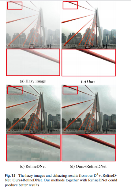 为了解决这些缺陷,RefineDNet提出了一种有效的方法,通过改进DCP处理的结果并执行感知融合来混合不同的去雾结果,以获得更有资格的结果。我们认为我们的方法也可以从这样的处理过程中受益,因此我们尝试用我们估计的传输图替换RefineDNet中嵌入的DCP。由于预训练的RefineDNet更好地适应了原始DCP的传输幅度,我们首先根据 min γ ∥ mean ( T γ D 4 ) − mean ( T D C P ) ∥ \min_{\gamma} \left\| \text{mean}(T_{\gamma D4}) - \text{mean}(T_{DCP}) \right\| minγ∥mean(TγD4)−mean(TDCP)∥对我们的传输进行修改,使其接近DCP的幅度,其中 T D 4 T_{D4} TD4是我们方法的传输, T D C P T_{DCP} TDCP是由DCP计算的传输。我们可以解出 γ = log ( mean ( T D C P ) ) / log ( mean ( T D 4 ) ) \gamma = \log(\text{mean}(T_{DCP})) / \log(\text{mean}(T_{D4})) γ=log(mean(TDCP))/log(mean(TD4))。通过用我们的 T γ D 4 T_{\gamma D4} TγD4替换RefineDNet中嵌入的DCP,我们发现我们的去雾结果的视觉质量也得到了大幅提升,甚至可以超越RefineDNet的原始结果。由于光晕效应而丢失的细节得到了有效的恢复,并且遭受了较轻的其他伪影,如噪声和块效应。这些实验验证了,通过适当的后处理或细化步骤,我们的模型也可以克服由ASM模型带来的局限性。