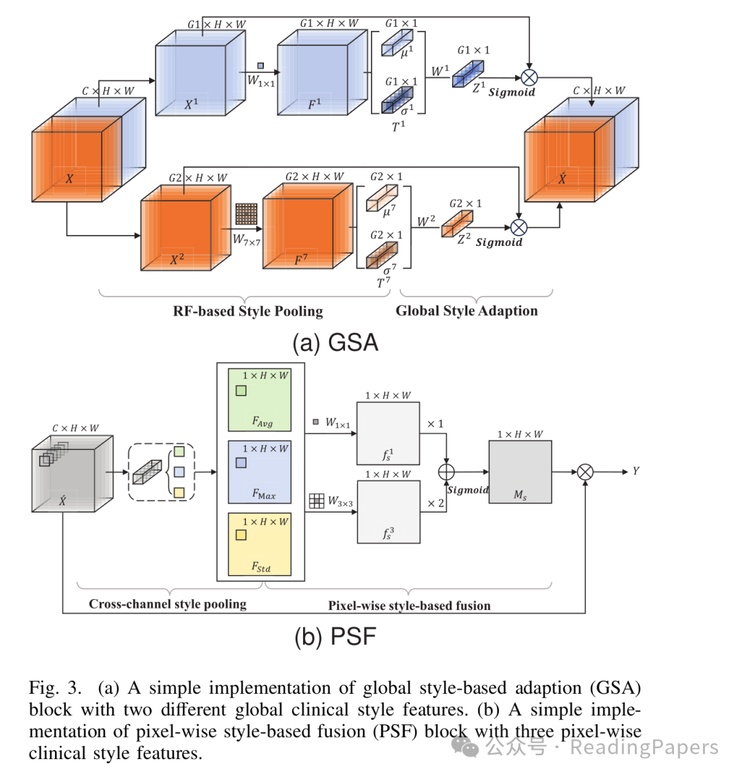 图3:(a)GSA模块通过不同感受野捕捉全局风格;(b)PSF模块融合像素级风格