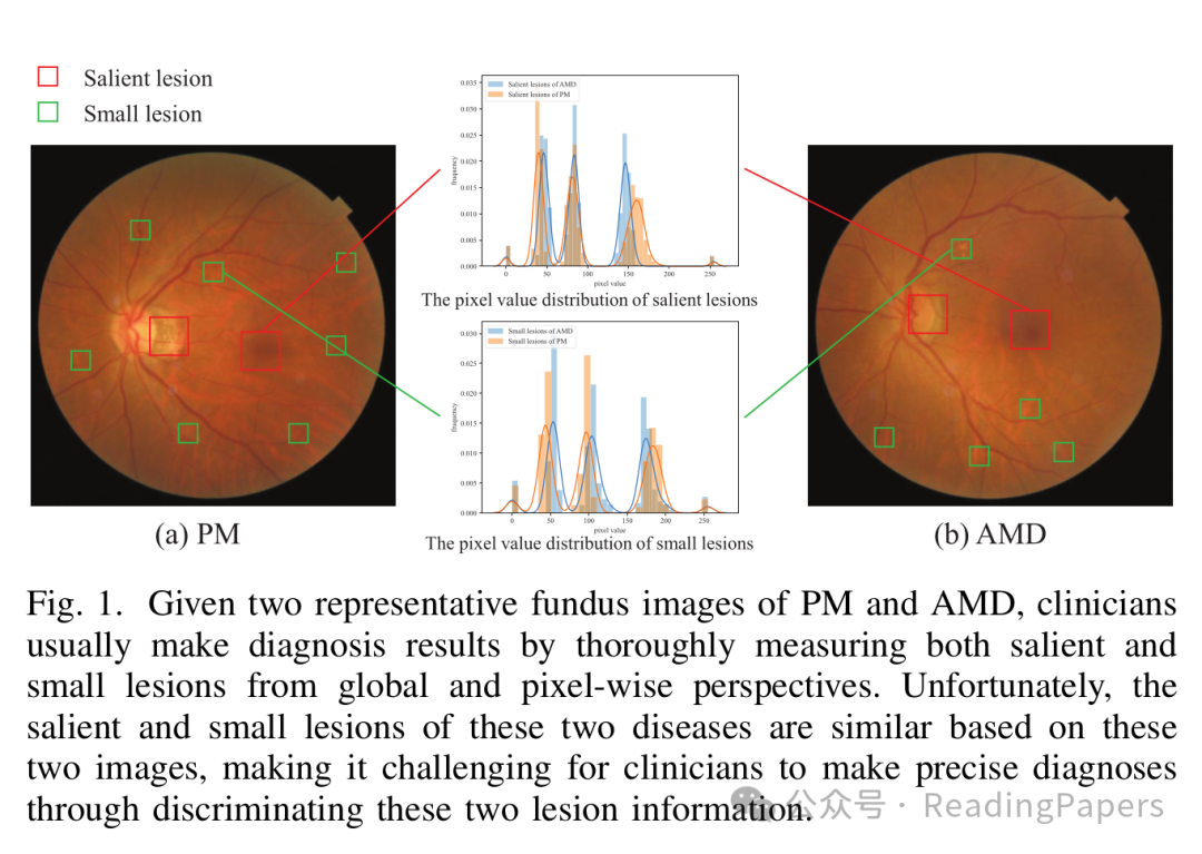 如图1所示,病理性近视(PM)和年龄相关性黄斑变性(AMD)的眼底图像中,相似的显著与微小病变让临床医生都难以区分,更别说深度学习模型了。