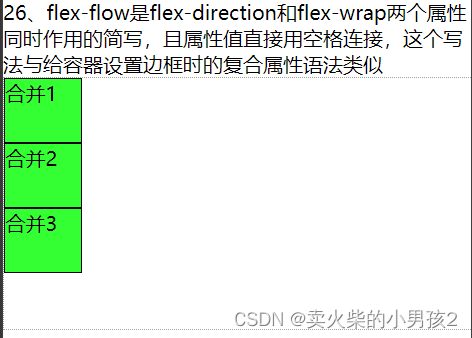 /* 26、flex-flow是flex-direction和flex-wrap两个属性同时作用的简写,且属性值直接用空格连接,这个写法与给容器设置边框时的复合属性语法类似 */