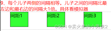 <view style="color: red;">9、每个儿子两侧的间隔相等。儿子之间的间隔比最左边和最右边的间隔大1倍。具体看模拟器</view>