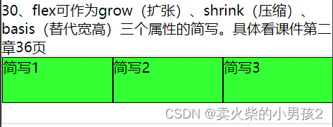 /* 30、flex可作为grow(扩张)、shrink(压缩)、basis(替代宽高)三个属性的简写。 具体看课件第二章36页 */