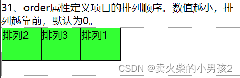 31、order属性定义项目的排列顺序。数值越小,排列越靠前,默认为0。