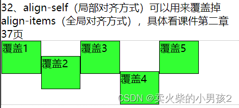 <view>32、align-self(局部对齐方式)可以用来覆盖掉align-items(全局对齐方式),具体看课件第二章37页</view>