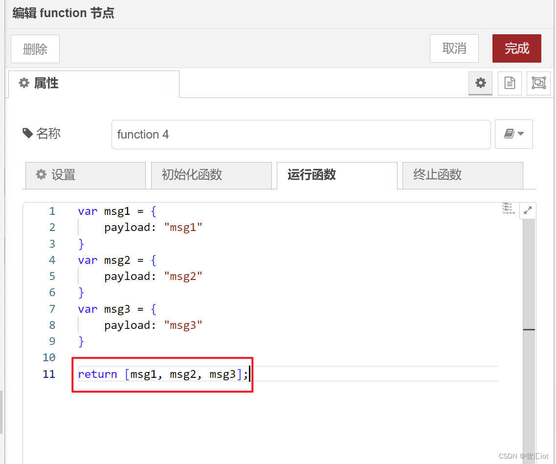 在默认的情况下function节点只有一个输出,并直接返回msg对象进行输出,在设置了多个输出后需要在函数中返回一个数组,这个数组中的每一个元素对应着function节点的一个输出。
