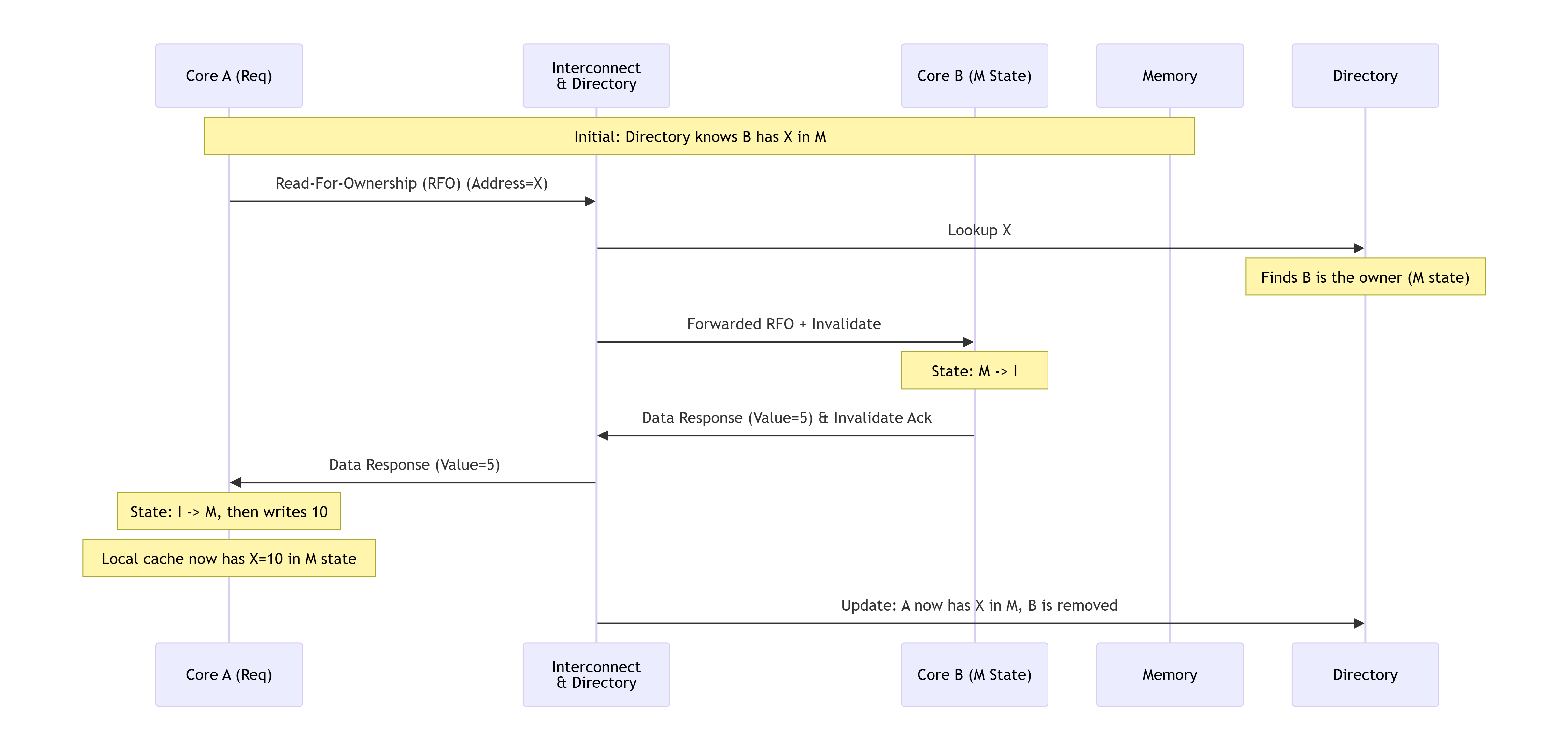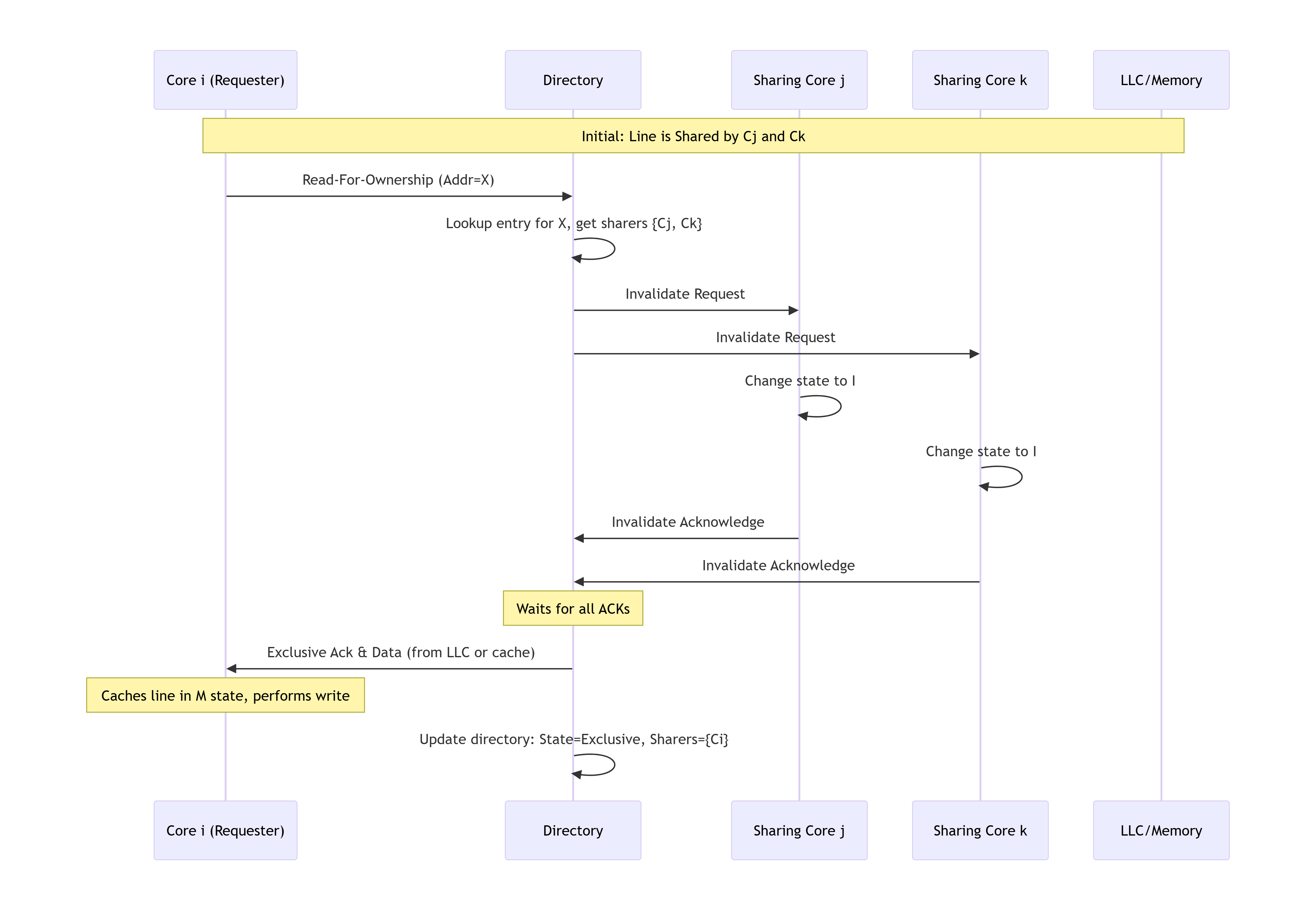 工作原理:当一个核心想要修改一个缓存行时,它首先确保自己是这个缓存行的唯一持有者。它通过向其他持有该缓存行副本的核心发送“无效化”消息来实现这一点。其他核心收到消息后,将自己的副本标记为“无效”。此后,修改核心可以安全地在其私有缓存中进行写入,而其他核心如果再想读取,将发生缓存未命中,从而必须从修改核心或内存获取最新的数据。