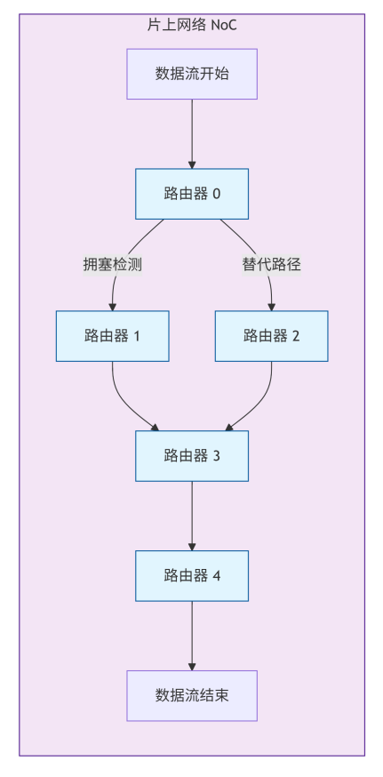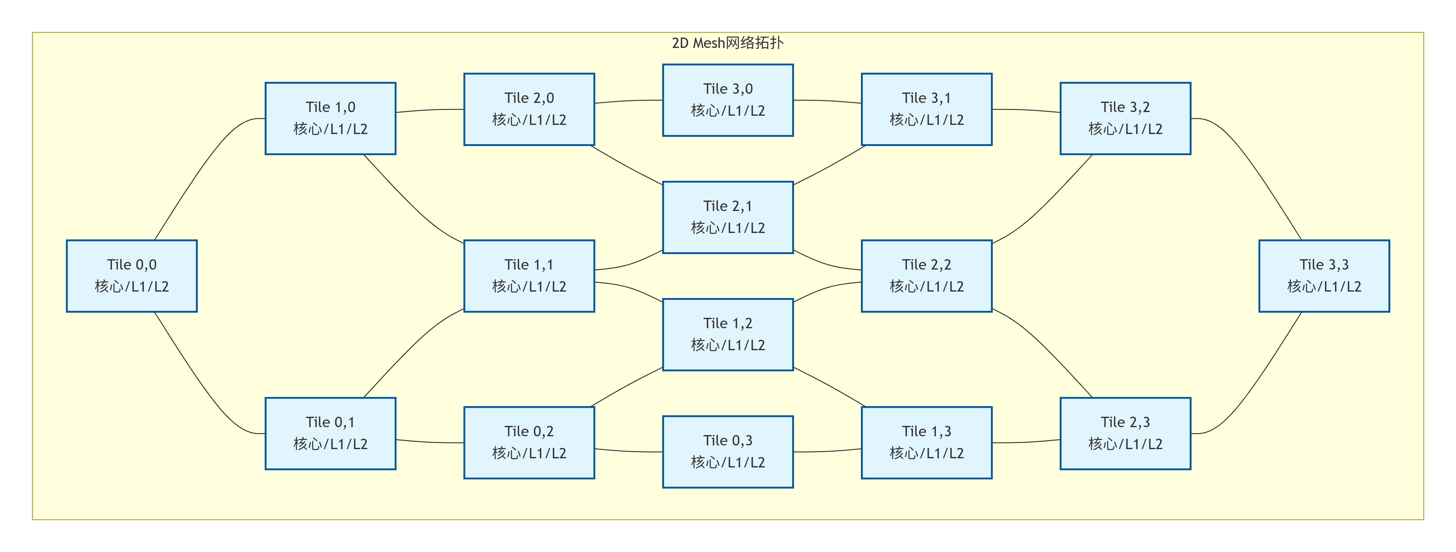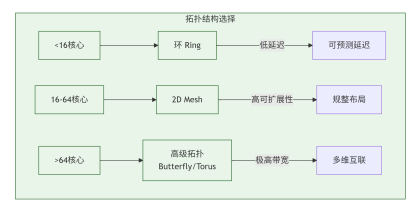 网络延迟:在大规模Mesh网络中,最远节点间的通信延迟可能达到数百个周期,成为性能瓶颈。