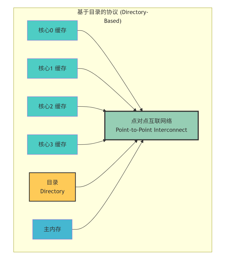 工作原理:在系统中维护一个集中的目录,来记录每一个缓存行(一致性的基本单位)被哪些核心缓存了。当一个核心需要修改某个缓存行时,它不再广播,而是先查询目录。目录会准确地知道需要通知哪些核心,然后只向这些核心发送点对点的无效化或更新消息。