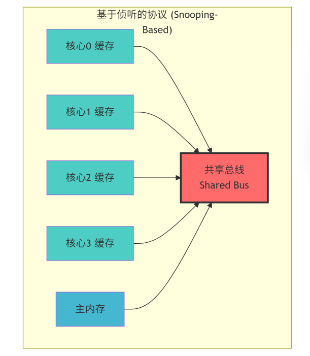 工作原理:所有缓存控制器都连接在一个共享的媒介(如总线)上。当一个缓存需要执行一个可能影响一致性的操作(如写入)时,它通过这个共享媒介向系统中所有其他缓存广播一个消息。其他缓存“侦听”到这个消息后,会根据协议规则采取相应行动(如无效化自己的副本)。