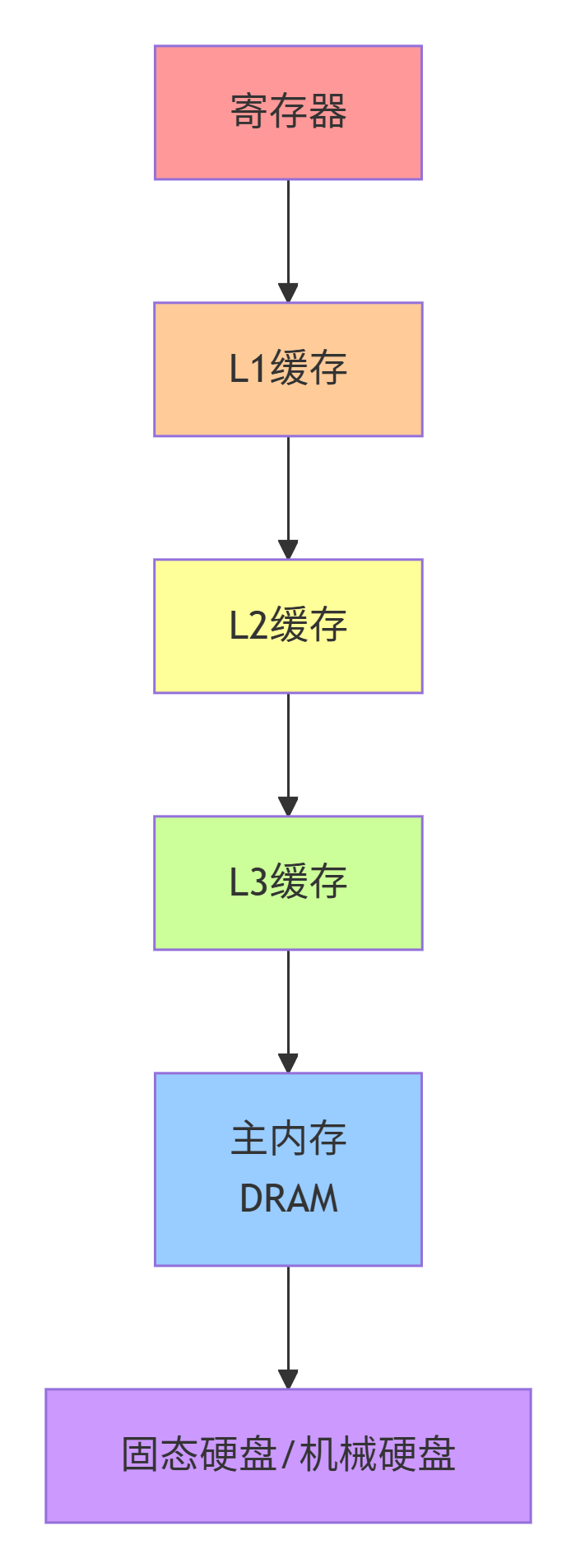 存储器的层次结构如下图所示,从上至下,速度变慢,容量变大,单位成本降低。