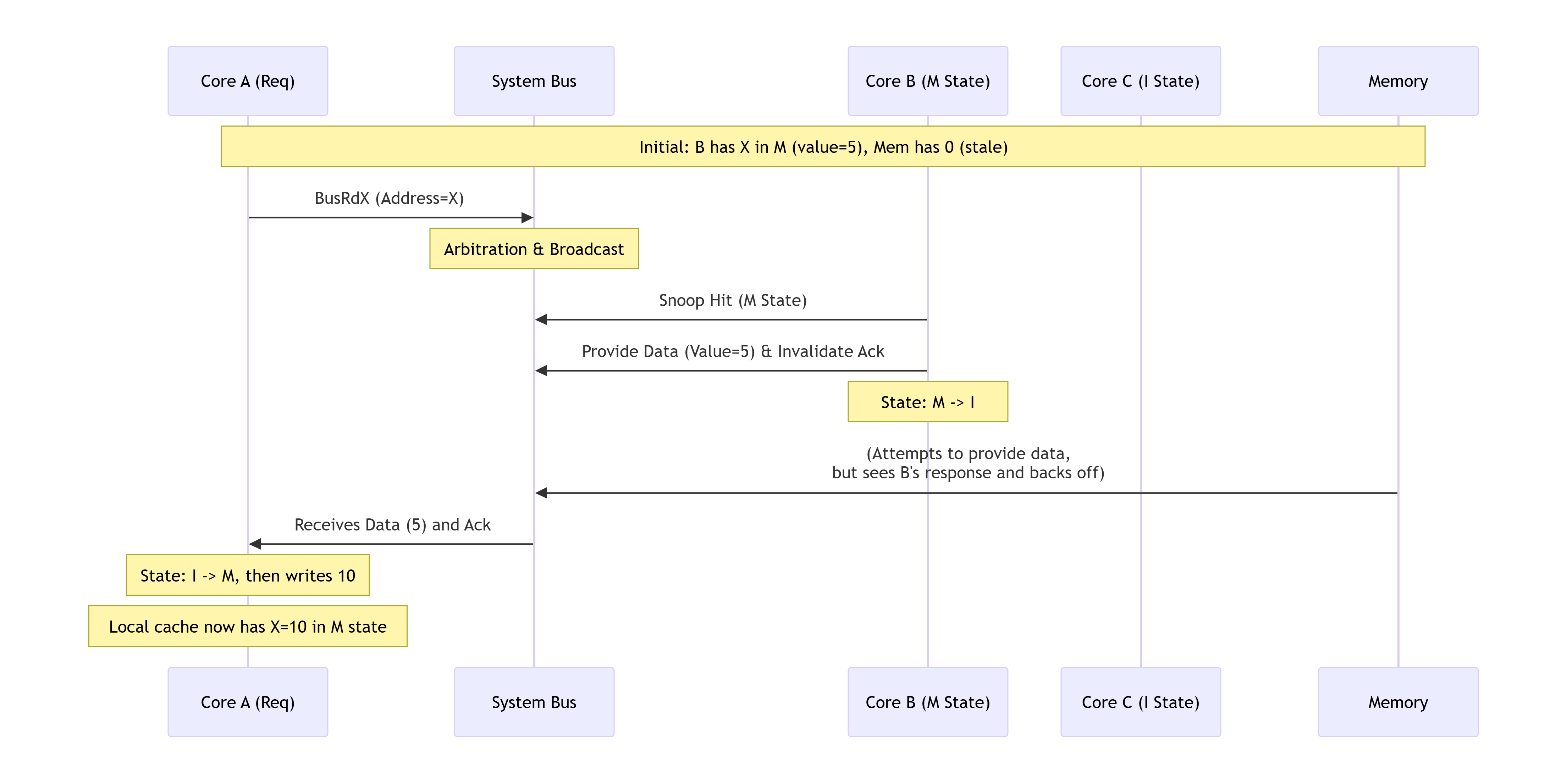 M (Modified):代表"独占且最新",是性能的巅峰状态。核心可以无干扰地进行本地读写,无需任何外部通信。这是写操作的理想终点。
