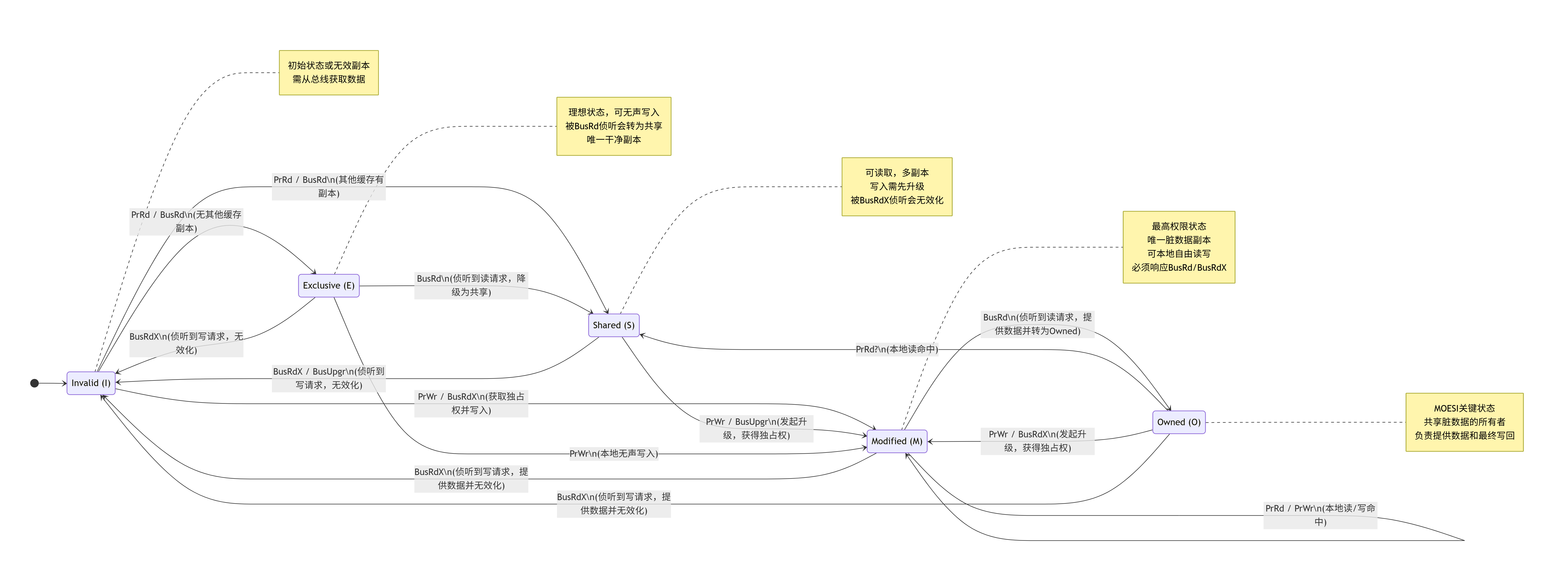 MOESI协议之所以能够成为现代多核处理器缓存一致性的基石,源于其精巧的状态设计和转换逻辑。让我们回顾其核心精髓: