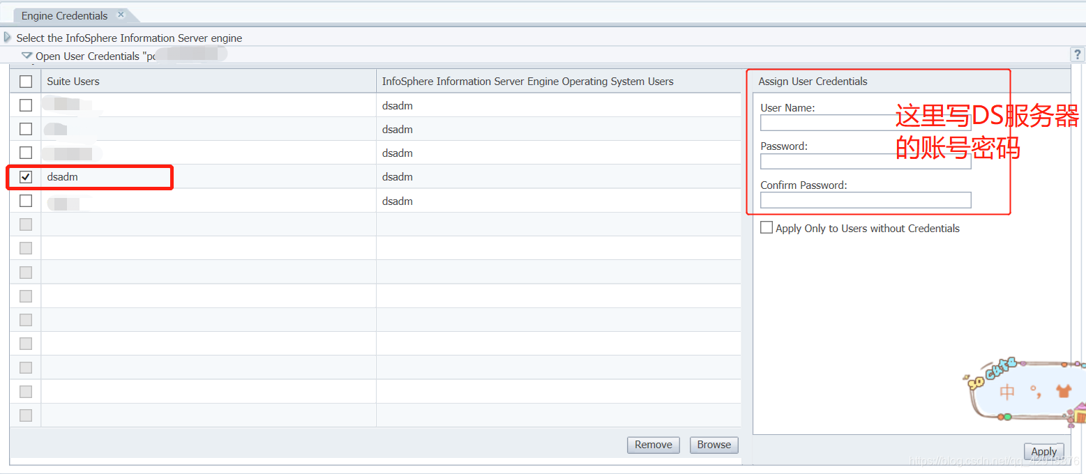 3、在打开的页面中,勾选上dsadm用户,并在右侧填写用户名和密码。