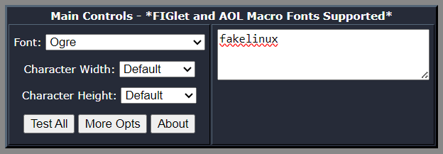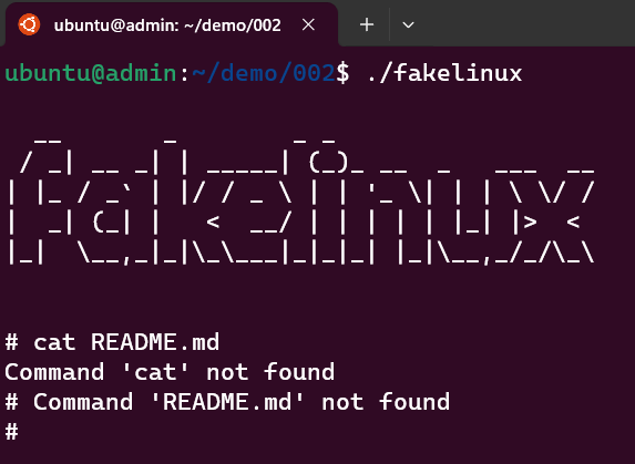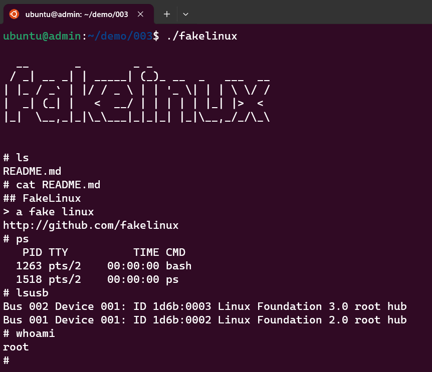 c语言编写一个假的linux (1) 代码在 https://github.com/fakelinux/demo/blob/master/001/main.c。找一个在线的 ascii 字体生成器,生成一个 “FakeLinux” 字符。拷贝下来,贴到 c 代码 fakelinux.c 里。接下来,假装有一个文件系统,并可以相应不带参数的。但是这个假的也太假了,还不支持参数。1、printf 中, 直接打印。现在已经实现了一个 假的。