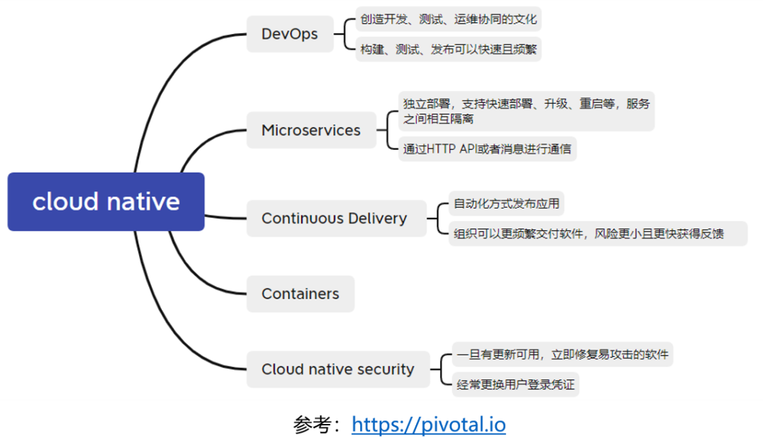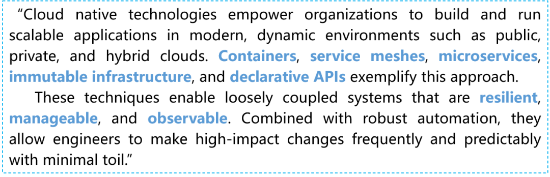 上图是CNCF对云原生的定义,从字面意义上来讲,cloud native就等于cloud+native。简单来说,云原生代表着因云而生。它主要包含以下方面: