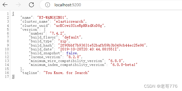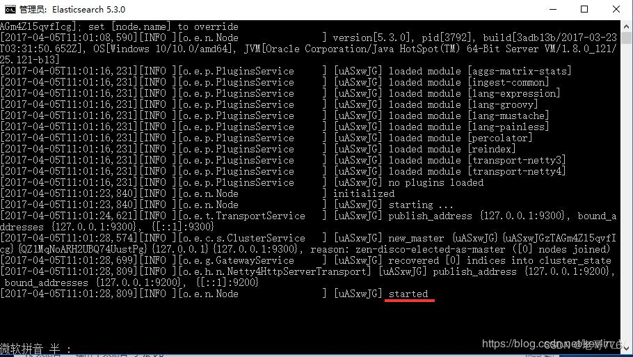 看到started说明启动成功,打开浏览器http://localhost:9200测试一下,如下图(如果不成功,关闭自带杀毒软件重试)