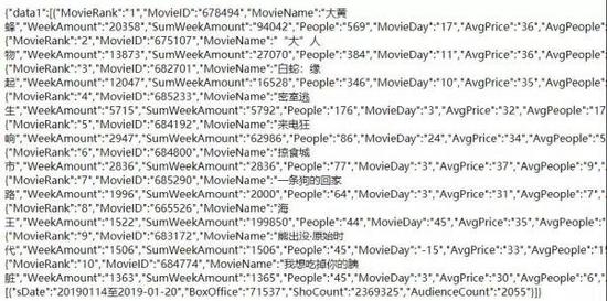 该网站的周票房json数据地址可以通过抓包工具找到,网址为http://www.cbooo.cn/BoxOffice/getWeekInfoData?sdate=20190114
