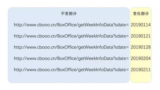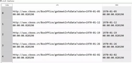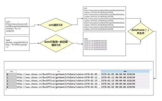 url_df = pd.DataFrame({'urls':['http://www.cbooo.cn/BoxOffice/getWeekInfoData?sdate=' for i in range(5)],'date' :pd.date_range(20190114,freq = 'W-MON',periods = 5)}) ''' 将网址相同的部分生成5次,并利用pandas的时间序列功能生成5个星期一对应的日期。 其中用到了第一部分提供的多个数据类型: range(5)属于列表, 'urls':[]属于字典, pd.dataframe属于dataframe ''' url_df['urls'] = url_df['urls'] + url_df['date'].astype('str')