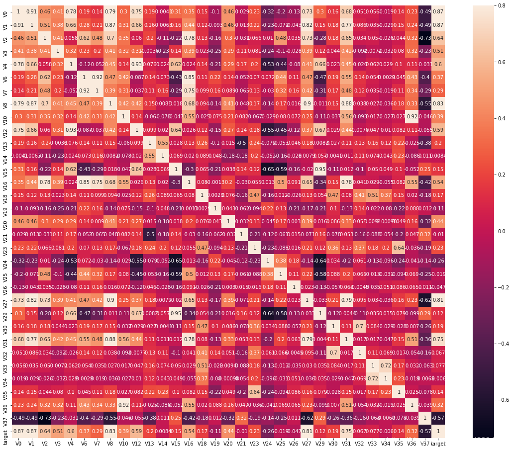 ax = sns.heatmap(train_corr, vmax=.8, square=True, annot=True) # 画热力图 annot=True 显示系数