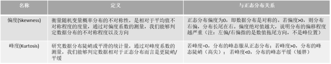 一般会拿偏度和峰度来看数据的分布形态,而且一般会跟正态分布做比较,我们把正态分布的偏度和峰度都看做零。如果我们在实操中,算到偏度峰度不为0,即表明变量存在左偏右偏,或者是高顶平顶这么一说。