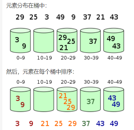 - 遍历输入数据,并且把数据一个一个放到对应的桶里去;