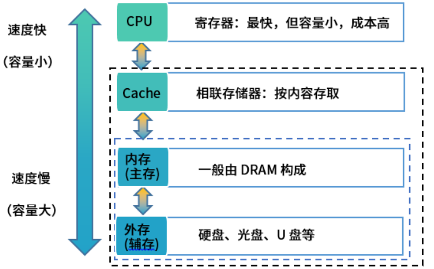 (2)关于多级存储体系不同层次的大小、速度等对比(见下图);
