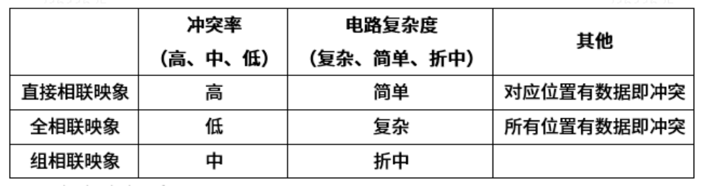 2、Cache映射方式:全相联、组相联、直接相联映像的对比(冲突率依次增高,电路复杂度依次降低):