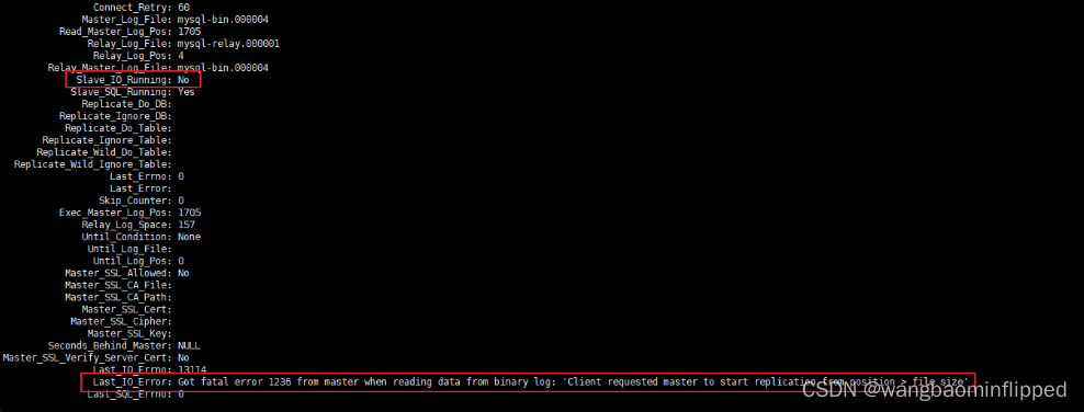 Last_IO_Error: Got fatal error 1236 from master when reading data from binary log: 'Client requested master to start replication from position > file size'解决方案: