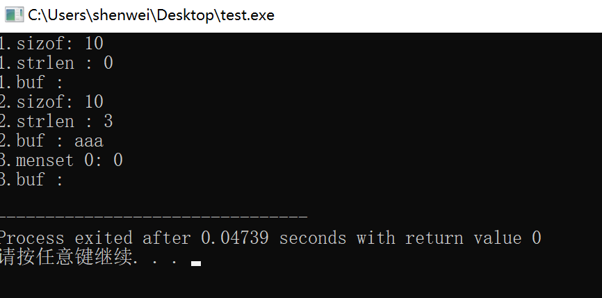 从运行结果中可以看出,初始时a的大小为10,但是内部没有数据,因此,sizeof(a)=10,strlen(a)=0.