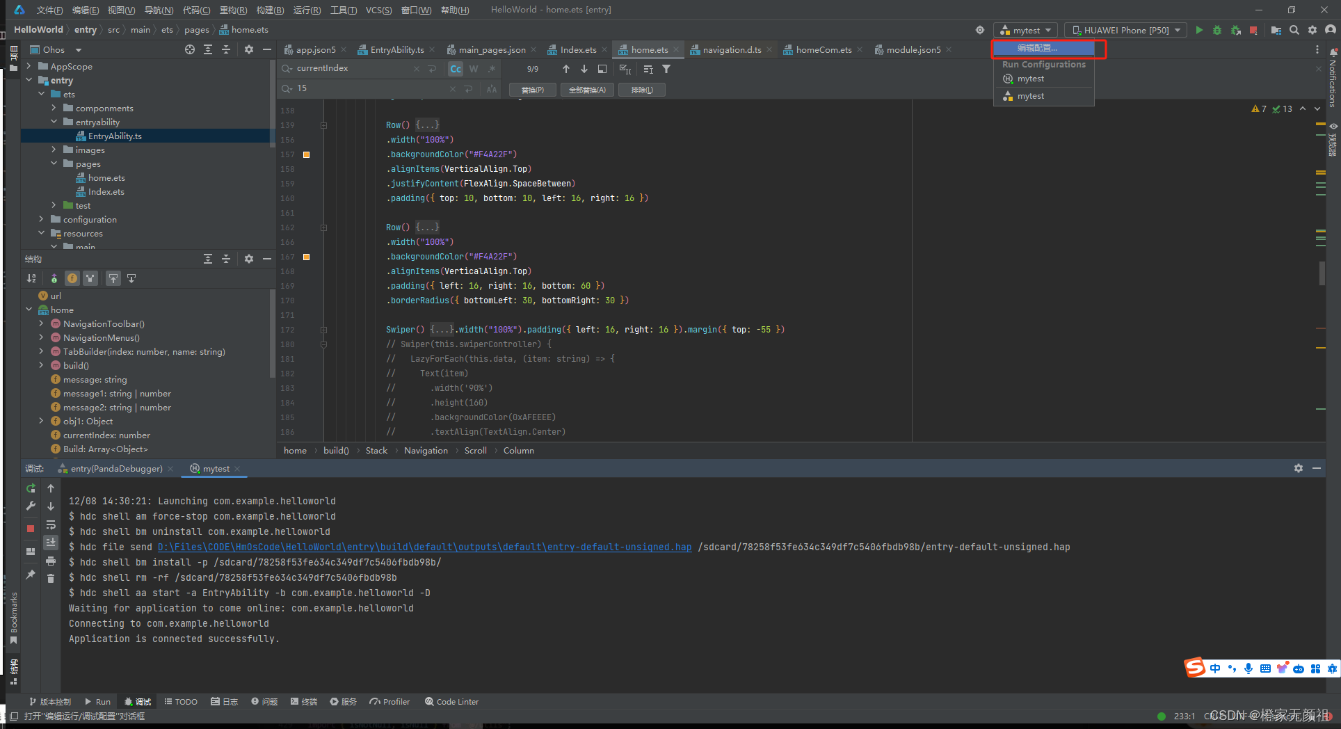 鸿蒙HarmonyOS 更改默认启动页面 1.找到名叫 Entryability.ts 的文件,找到 windowStage.loadContent() 这个方法,圈出来的就是默认启动页面。2.默认启动页需要在 main_pages.json 这个文件中配置过才行。
