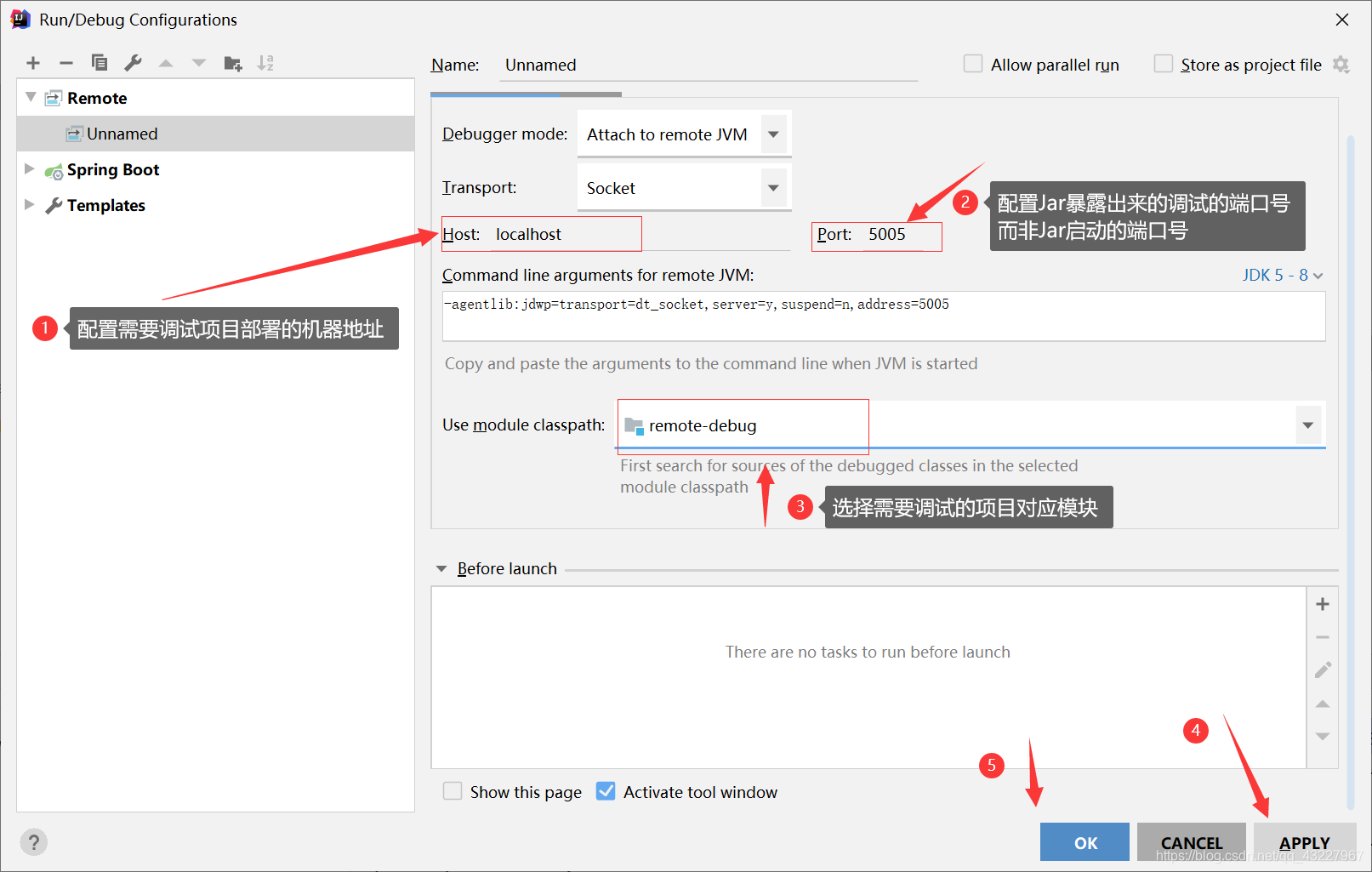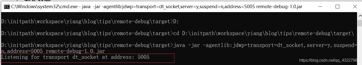 java -jar -agentlib:jdwp=transport=dt_socket,server=y,suspend=n,address=5005 remote-debug-1.0.jar