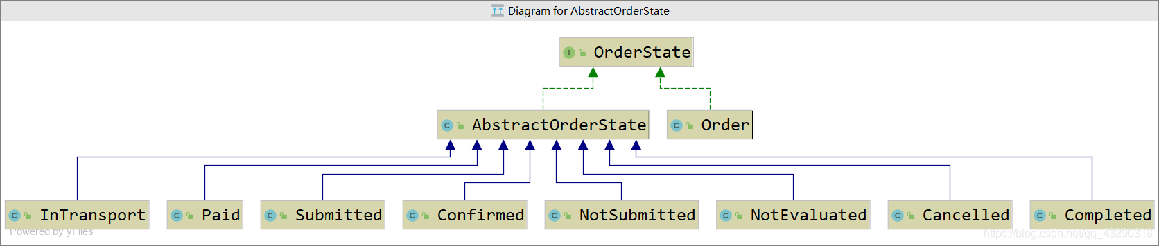 - 订单实现了 OrderState 接口,并实现了全部方法,但是具体的实现 (判断、业务逻辑、状态改变) Order 类本身并不负责,而是委托给了 "当前的订单状态类实例"
