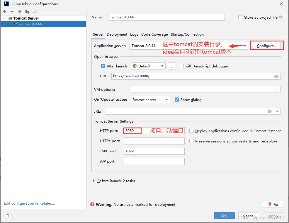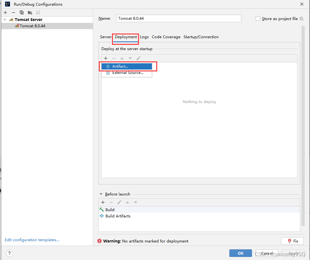 你会发现下面idea又提示我们,还没有配置部署的artifact。直接点击Fix(见上图)即可。