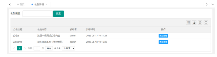 为了使用户能够了解到相关公告信息,系统应设置一个醒目的公告展示界面,用来展示各类重要信息,如图书馆的开放时间调整、新书上架通知、热门书籍推荐、借阅政策变更、线下读书活动预告以及系统维护公告等。通过查询这些公告,可以确保用户能够随时掌握图书馆的最新动态,合理安排自己的借阅计划,不错过任何有价值的资讯与活动。