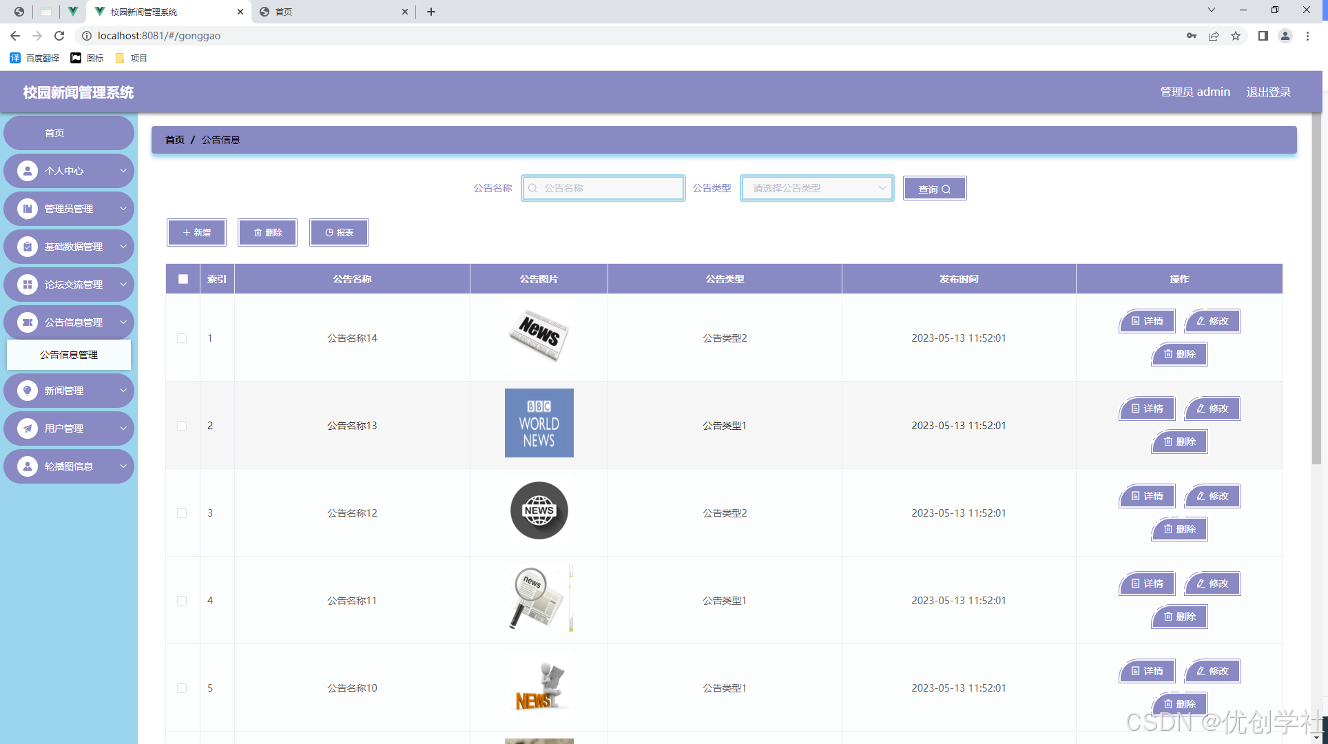 管理员可以对公告信息进行管理,可以新增公告信息,修改公告信息,删除无效的公告信息。公告信息管理界面如图5.2所示。