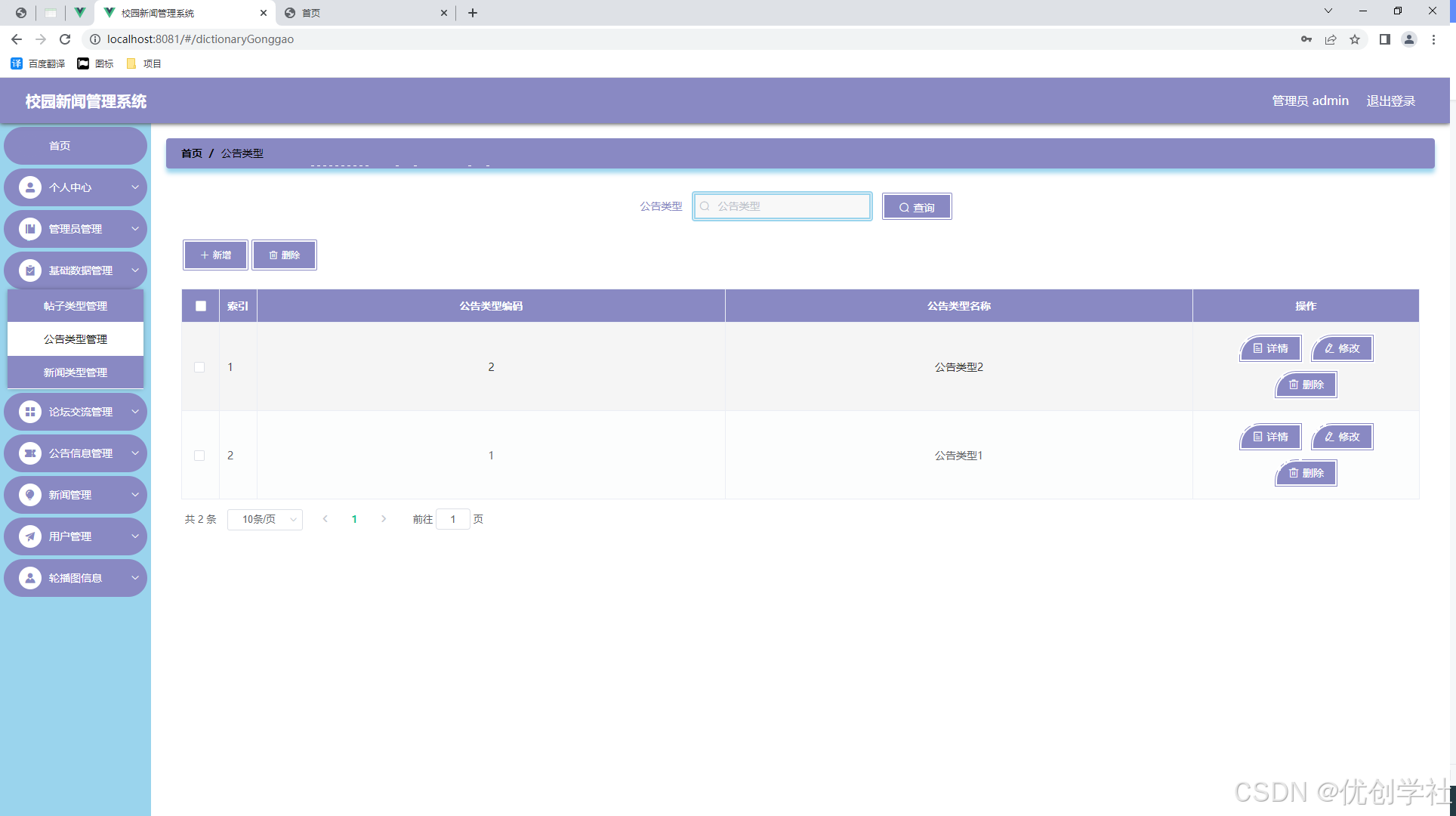 公告类型管理页面显示所有公告类型,在此页面既可以让管理员添加新的公告信息类型,也能对已有的公告类型信息执行编辑更新,失效的公告类型信息也能让管理员快速删除。下图就是公告类型管理页面。公告类型管理界面如图5.3所示。