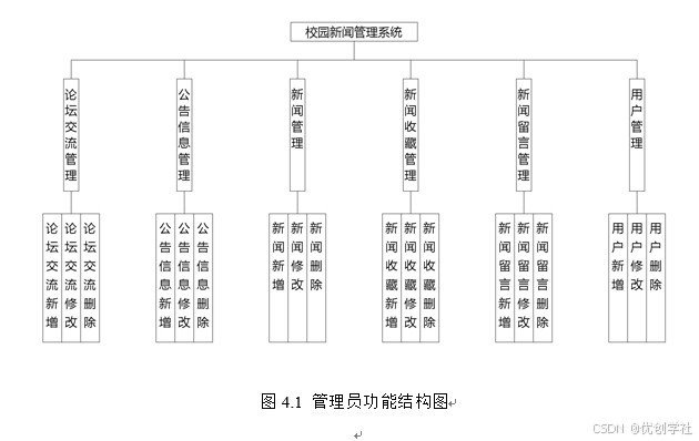 第四章:这个章节主要绘制出了系统功能架构,让我们更直观了解校园新闻管理系统的功能,对后台数据库表进行了设计,还画出了对应的E-R图。