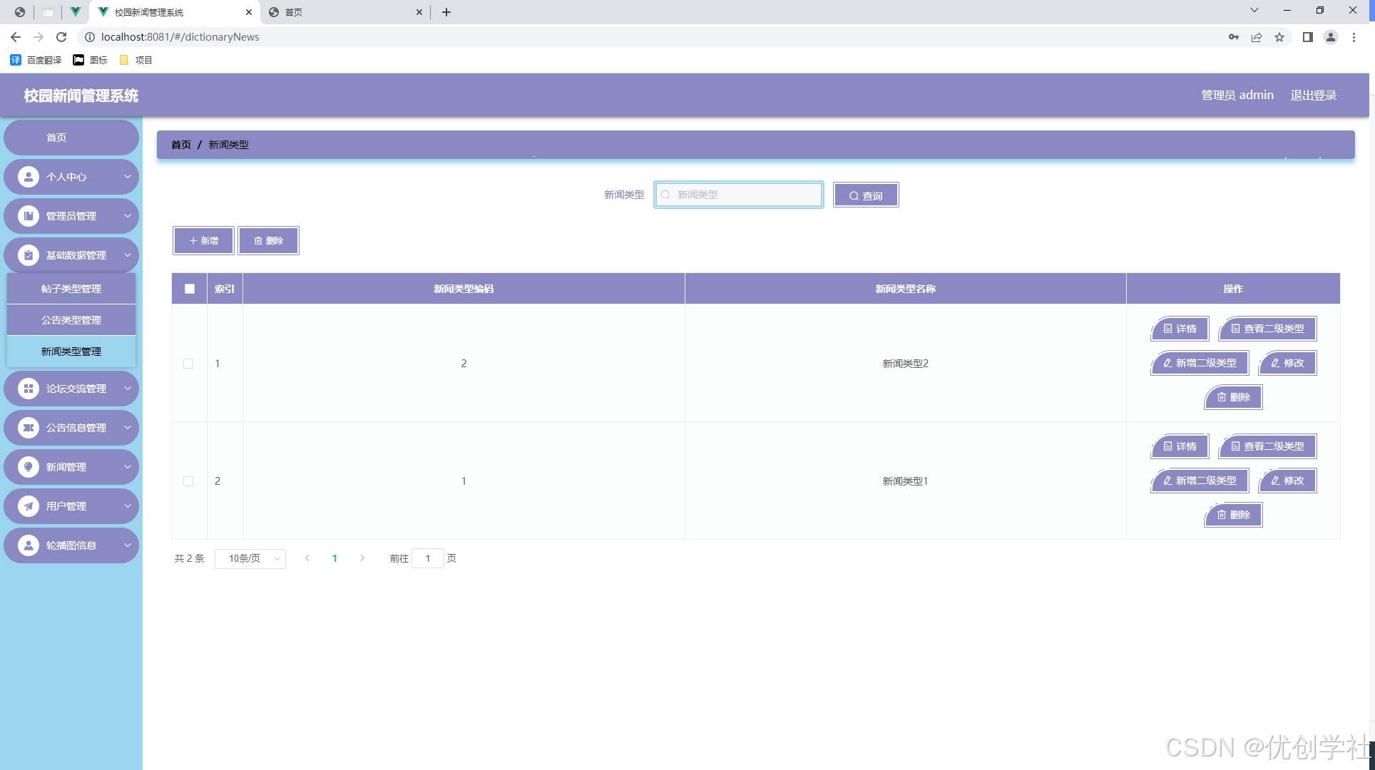 如图5.5显示的就是新闻类型管理页面,此页面提供给管理员的功能有:新增新闻类型,修改新闻类型,删除新闻类型。