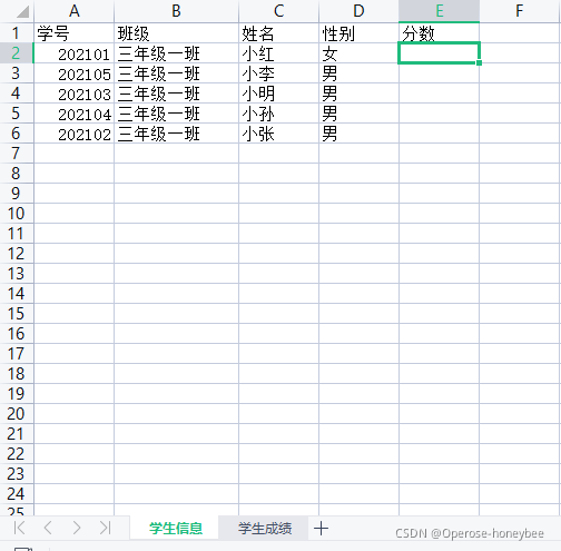 【1】有两个sheet页,一个是学生信息,一个是学生成绩,现在我们想要在学生信息的每一行后面添加每个学生对应的成绩(这里为了举例,所以用的数据比较少,如果数据量特别大的时候用vlookup函数则能很快完成统计)