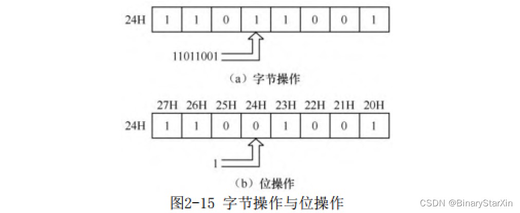 在进行字节操作时,用字节操作指令选中编址为24H的存储单元,然后可以将1B的数据存入该单元,或从该单元取出。图2-15(a)中是将1B的数据11011001存入编址为24H的存储单元。