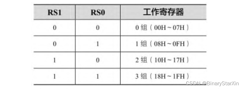 例如,当寄存器中的RS1=0、RS0=1时,1组(08H~0FH)寄存器处于工作状态。