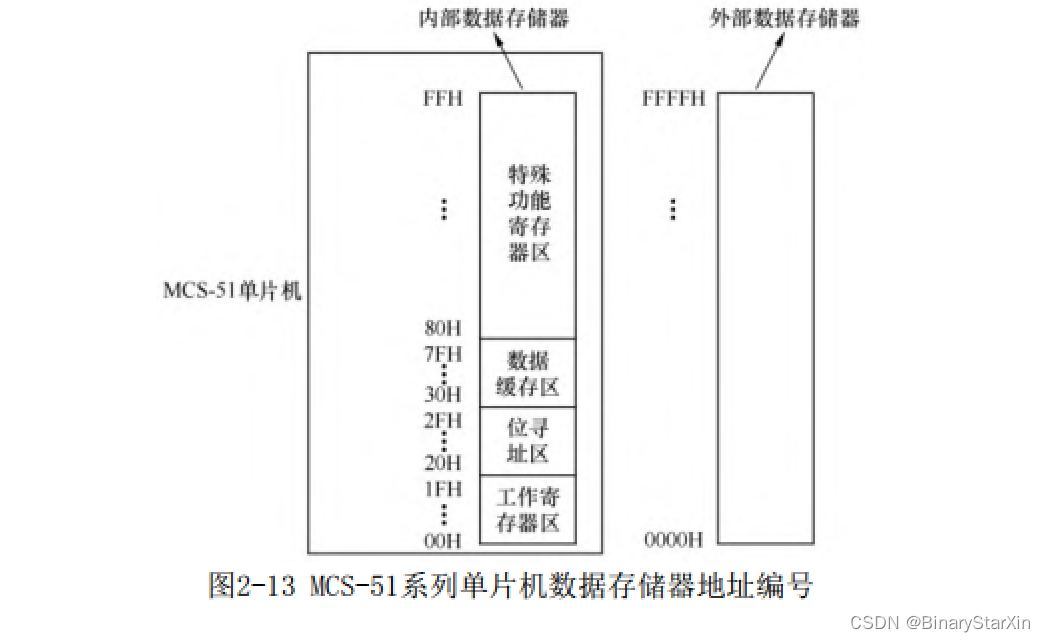 MCS-51系列单片机的内部数据存储器有256B的存储空间(即有256个存储单元,每个单元存储1B数据),地址编号为00H~FFH(也可用0000H~00FFH表示);外部数据存储器地址编号为0000H~FFFFH,有64KB的存储空间。外部数据存储器最开始的一段地址(0000H~00FFH)与内部数据存储器相同,对于相同的地址,单片机是通过不同的指令来区分的。MCS-51 系列单片机数据存储器的地址编号如图2-13所示。