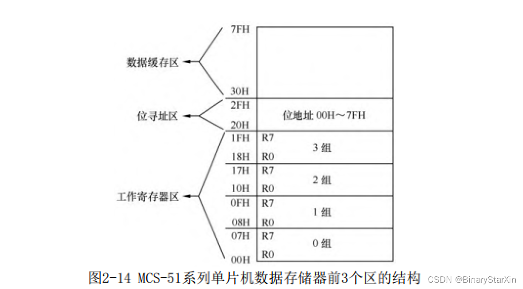 从图2-13中可以看出,内部数据存储器分为4个区:工作寄存器区、位寻址区、数据缓存区和特殊功能寄存器区。前3个区的详细结构如图2-14所示。