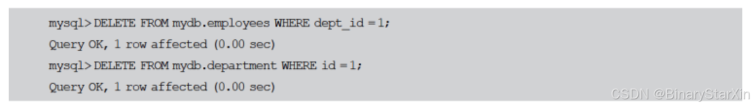 下面对具有外键约束关系的 employees(从表)和 department(主表)进行操作,具体SQL 语句及执行结果如下,